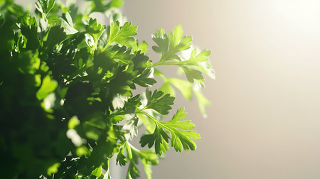 A sprig of fresh parsley showcases its lush green leaves against a soft, neutral background, evoking feelings of freshness and healthfulness.