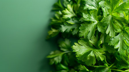 Close-up of fresh parsley leaves arranged on a solid green background, representing freshness, health, and a natural aesthetic.