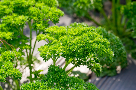 Curly parsley leaves closeup in the garden