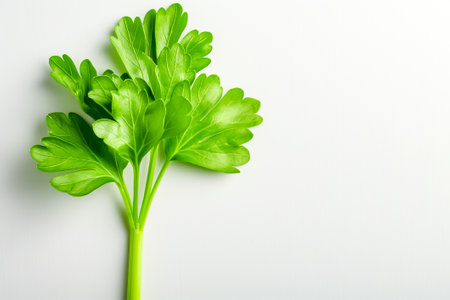 A single sprig of parsley is displayed on a light background, highlighting its bright green leaves and delicate structure. This fresh herb adds color and flavor to various dishes.
