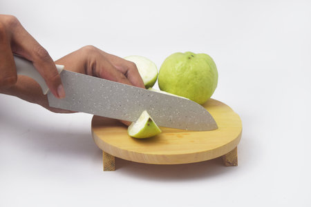 Someones hand is cutting green guava on a wooden coaster and on a white background