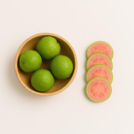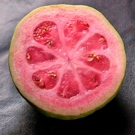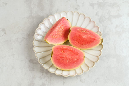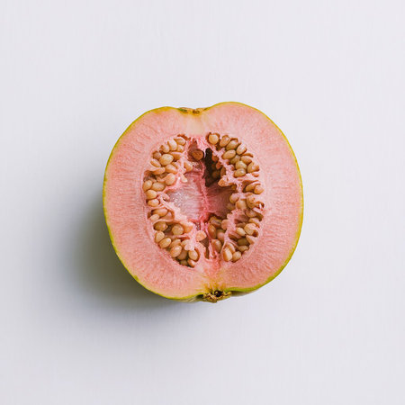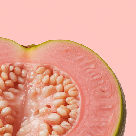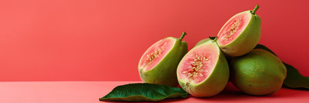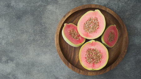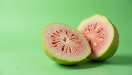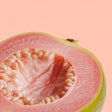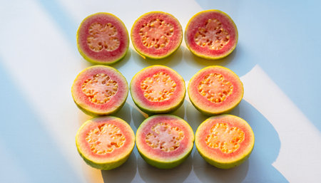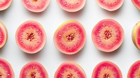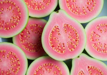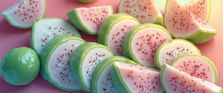 A stunning arrangement of freshly sliced guava reveals its juicy pink interior, dotted with tiny seeds, against a soft pastel background. This vibrant display of tropical fruit invites a sense of freshness and indulgence, perfect for health enthusiasts and culinary creatives alike.