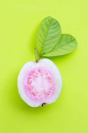 Isolated Guava, whole ripe guava fruit with sliced piece abd guava leaves.
