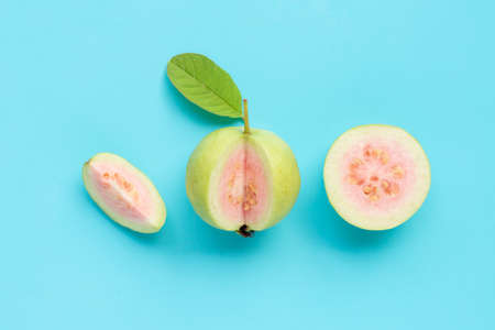 Fresh guava fruit on blue and white background. Tropical fruit.