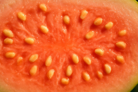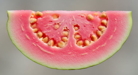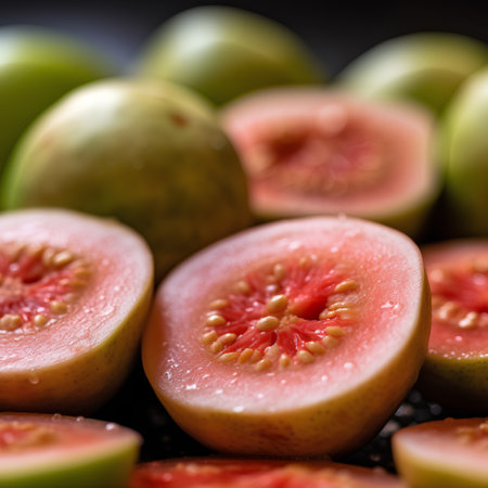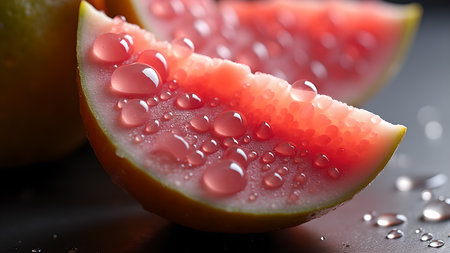 Close-up shot of fresh guava slices covered in water droplets, highlighting its juicy and refreshing qualities. Perfect for healthy eating and tropical themes.