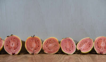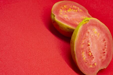 Guava fruits broken in half. Tropical fruits. Guavas in halves. Source of vitamin C. Fruit indicated for the immune system. antioxidant. Detox diet.