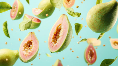 Juicy guavas are suspended in mid-air against a bright blue backdrop, accompanied by fresh green leaves. This lively arrangement showcases their natural beauty.