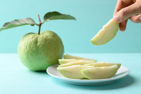 Sliced Guava fruit on plate with hand picking and eating, Tropical high vitamin C fruit