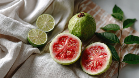A visually appealing arrangement of fresh tropical guava and sliced limes on a soft textured fabric background, perfect for food styling or seasonal recipes.