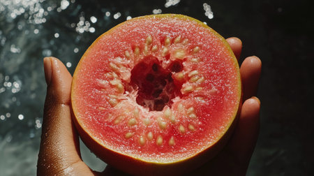 A hand holding a red guava freshly sliced open, with juicy pink flesh exposed and droplets of water glistening on the surface.