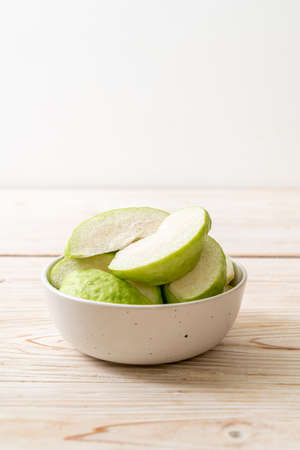 Fresh guava fruit in a bowl on wooden table, stock photo
