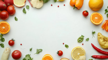 Fresh fruits and vegetables arranged on a white background, AI