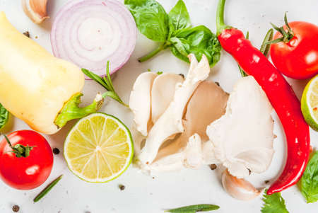 Food cooking background, white marble table. Fresh raw organic vegetables (tomatoes, peppers, mushrooms, onion), herbs, spices, lime for preparation dinner. Top view copy space
