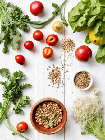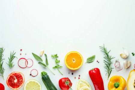 Minimalist food styling showcasing fresh ingredients like tomatoes, lemon slices, and herbs on a clean, white background. The simplicity and elegance make it ideal for culinary, health, and organic food themes.