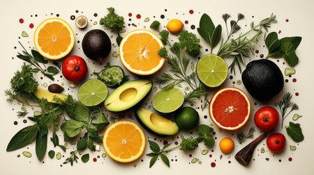 A vibrant and lively bunch of fruits and vegetables, bursting with superfoods and fresh ingredients like tangy lemon, zesty grapefruit, and juicy orange, all accented with the unique flavors of citron