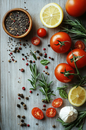 A vibrant collection of fresh tomatoes, garlic, lemons, and herbs is beautifully arranged on a wooden board. Bright colors and textures invite culinary exploration and creativity in the kitchen.