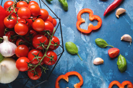 Tomatoes, bell peppers, olive oil, silician lemon and garlic over wooden table with copy space. Mediterranean food.