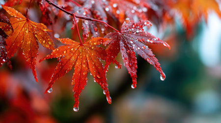Vibrant autumn maple leaves with water droplets close up