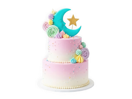 Threetiered pastel cake with moon and star decorations isolated on a transparent background