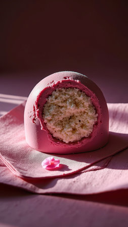 Pink glazed dessert with cream filling on textured napkin in warm light. That the image is generated using AI.