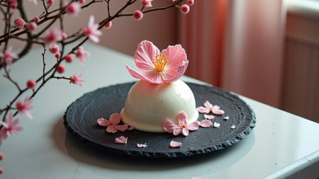 Elegant dessert with cherry blossom garnish on black plate. That the image is generated using AI.
