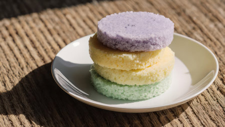 A stack of colorful Kueh Kosui, a traditional Malaysian dessert, sits on a white plate, showcasing its vibrant layers and tempting texture.