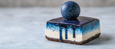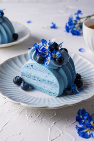 Elegant Blue Dessert with Fresh Blueberries and Edible Flowers on Plate.