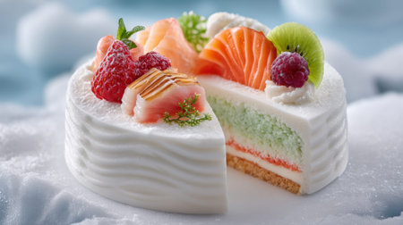 This stunning cake features a blend of salmon and fresh fruits, elegantly presented. Perfect for culinary exploration, gourmet events, and creative baking inspiration.