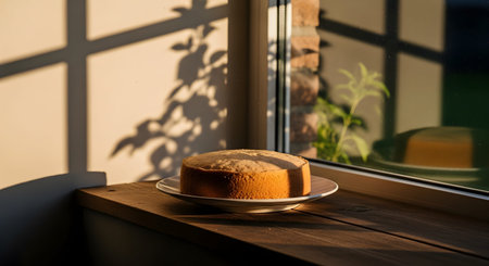 A freshly baked, golden-brown sponge cake cools on a white plate resting on a wooden window sill. The warm afternoon sunlight casts distinct shadows of leaves onto the wall and cake, evoking a rustic, homemade culinary atmosphere.