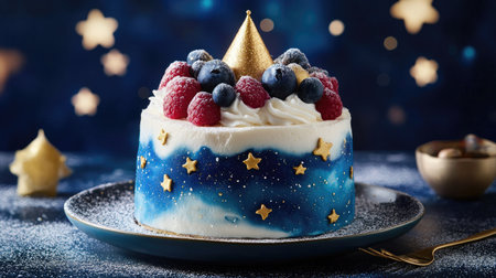 Celestial-themed birthday cake with galaxy buttercream, gold accents, and a crown of fresh mixed berries.