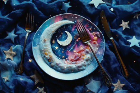 A plate with a crescent moon and stars on it. The plate is decorated with a piece of cake and a fork