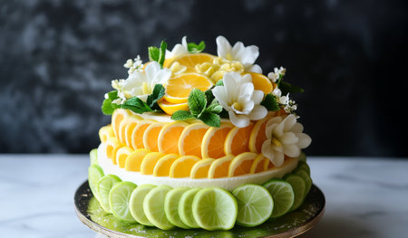 Vibrant Fruit-Decorated Cake with Citrus Slices and Flowers on Elegant Marble Surface.