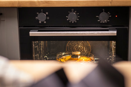 Preparing a Delicious Baked Meal: Gloved Hand Opens the Oven