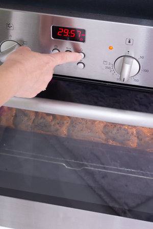 Housewife prepares cake in kitchen. Homemade cake baking in oven