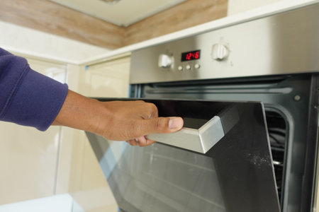 Cropped view of woman hand open door built in oven equipment, standing near kitchen appliance in modern interior house, baking food