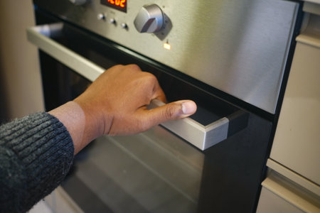 A person is using their hand to open a modern oven, engaging in culinary activities at home