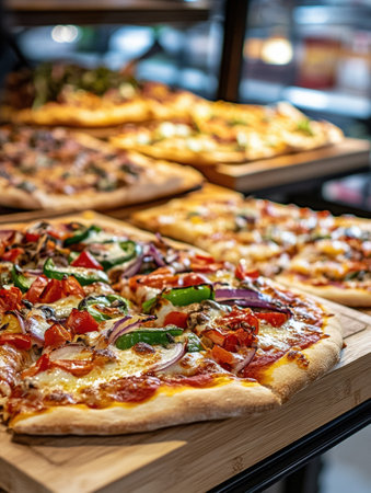 Golden crust pizza with colorful toppings is displayed on a wooden tray, showing a delightful culinary option in a contemporary grocery store.