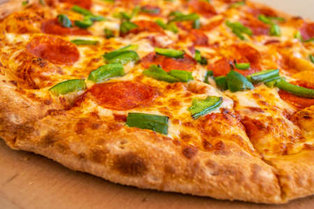 Pepperoni pizza closeup. Macro photo of salami pizza with green paprika, chili pepper and mozzarella cheese, traditional italian flatbread