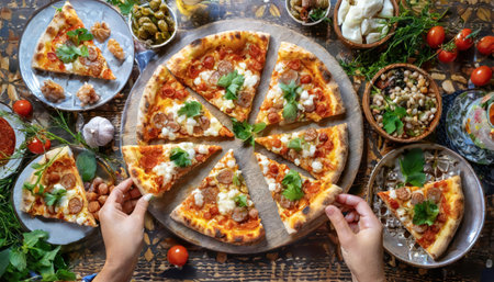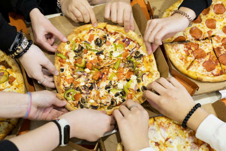 Top view, lots of friends, hands reaching for a slice of pizza on the table.