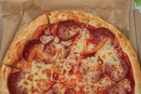 Pizza with hunting sausages is cut in a box. Top view.
