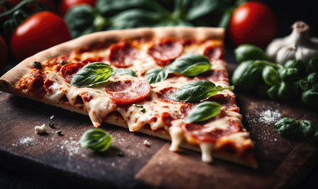 A mouth-watering slice of pepperoni pizza garnished with fresh basil on a wooden board. Perfect for food lovers and culinary enthusiasts.