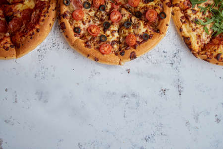 Three different kind of pizzas. Placed in a row on white rusty table. View from top with a space for your text.