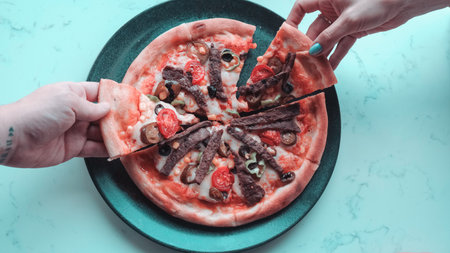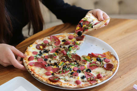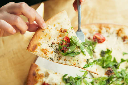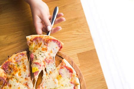 woman takes a hot piece of pizza with cheese, salami and pepperoni in italian cafe. top view