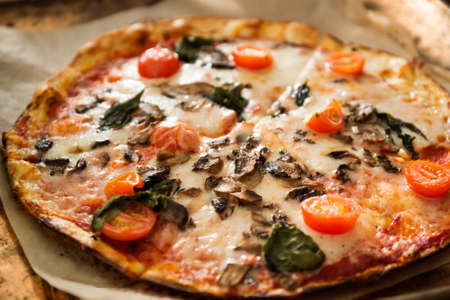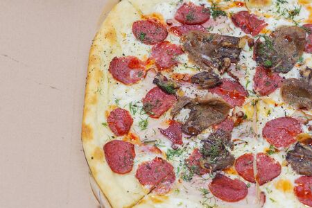 Hot and fresh pizza Margherita close-up. Mushrooms, cheese, smoked sausage, greens.
