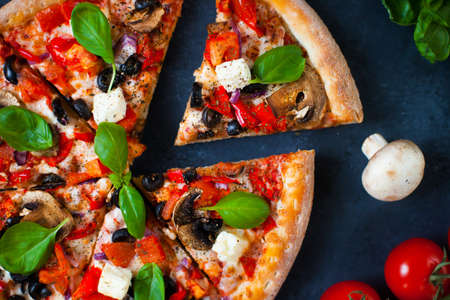 Slices Traditional Italian pepperoni pizza with tomatoes, cheese, onions and lots of herbs, on a dark slate table