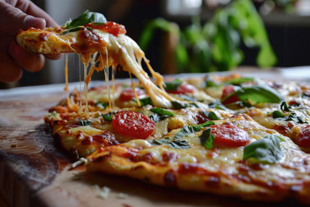 Hand grabbing a slice of pizza, melted cheese