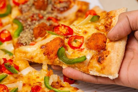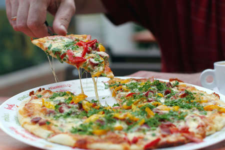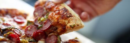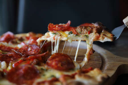 Close-up of hand taking slice of pizza with cheese spread. Pizza with tomatoes, hunting sausages and tomato sauce. Delicious food and home delivery concept