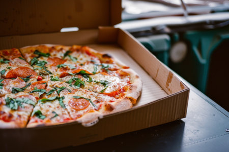 food and pieces of fresh red pizza carbonara in a gray paper carton box