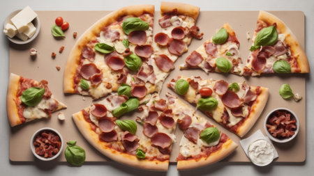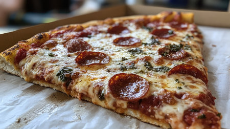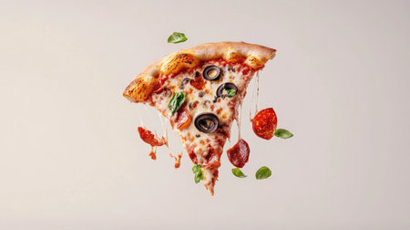 An inviting display of a flying pizza slice with delicious toppings, showcasing melted cheese, pepperoni, and fresh basil, ideal for food enthusiasts and culinary art.
