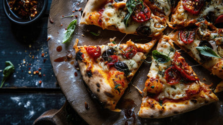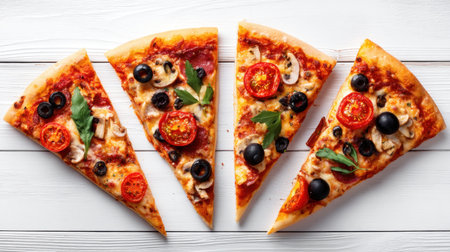 Indulge in these delicious pizza slices, topped with olives, fresh tomatoes, mushrooms, and basil, perfect for any meal. A feast for the eyes and palate!